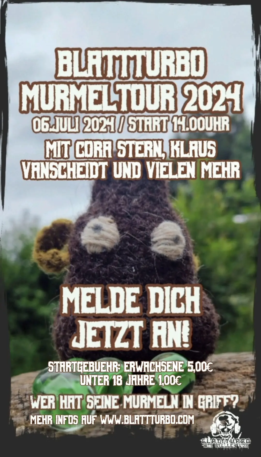 Dort erwarten euch weitere spannende Stationen, wie das Murmelfischen, bei der eure Füße mit Wasser in Berührung kommen werden. Lasst uns gemeinsam den 1. BlattTurbo Murmelpunk Pokal zu erobern.